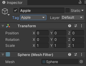 ->이후 화면에 나오는 모든 Apple 게임 오브젝트의 배열을 얻는 작업을 할 때, 이에 특정한 태그를 지정하면 이 작업이 좀 더 쉬워짐.