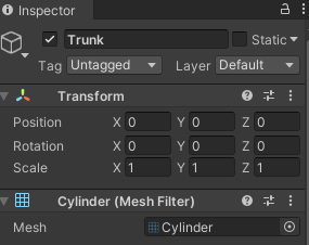 책에서는 이 컴포넌트의 설정을 설명할 때 Trunk(Cylinder) P:[0,0,0] R:[0,0,0] S:[1,1,1] 의 형식으로 설명하는 듯.